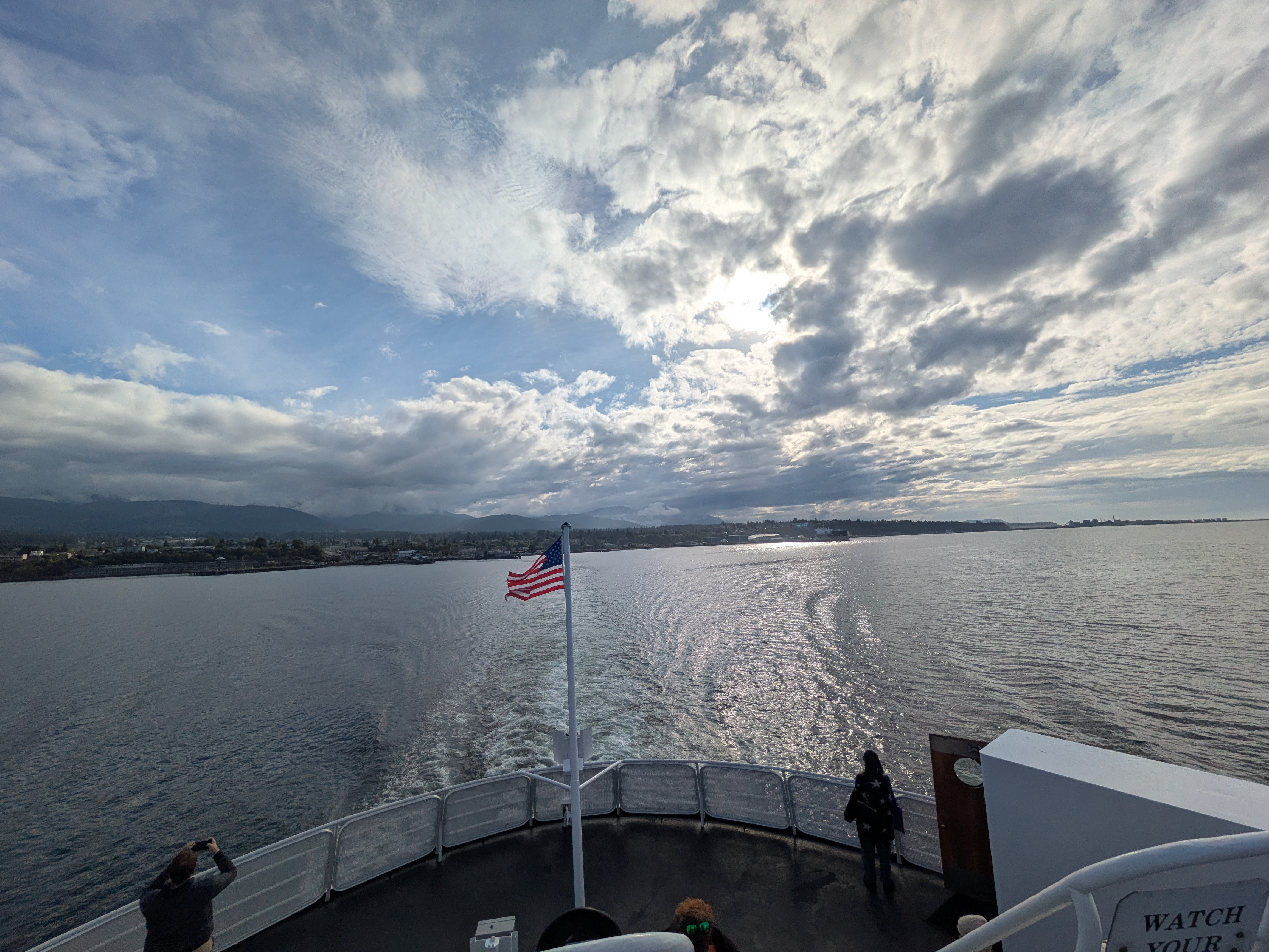 I picked up dinner, returned my rental car, grabbed my luggage, and hauled everything onto the ferry. The crossing through the strait was breathtaking. I could feel the rough currents and see both Vancouver Island’s calm skies and the stormy clouds hanging over the Olympic Mountains behind Port Angeles.