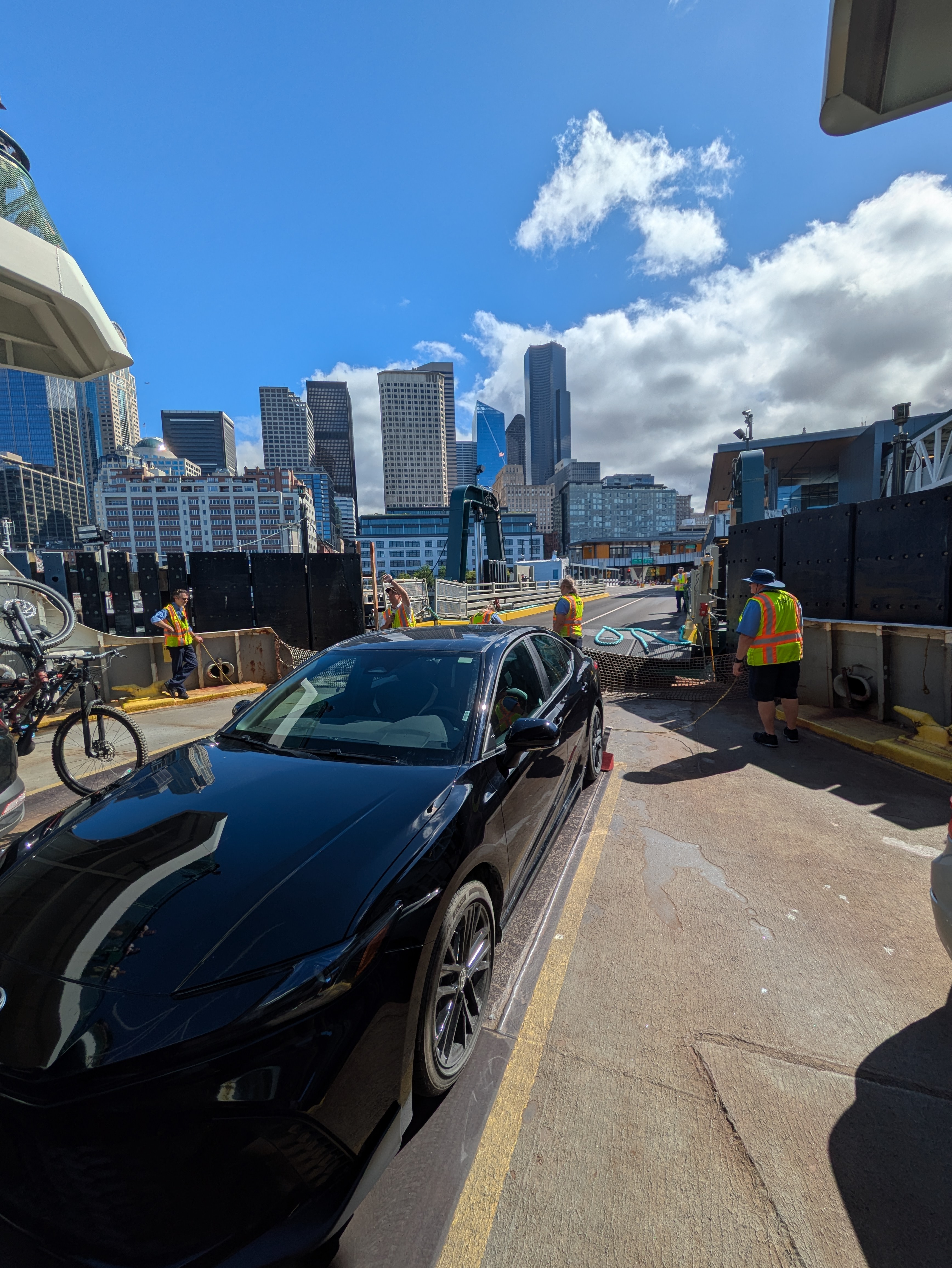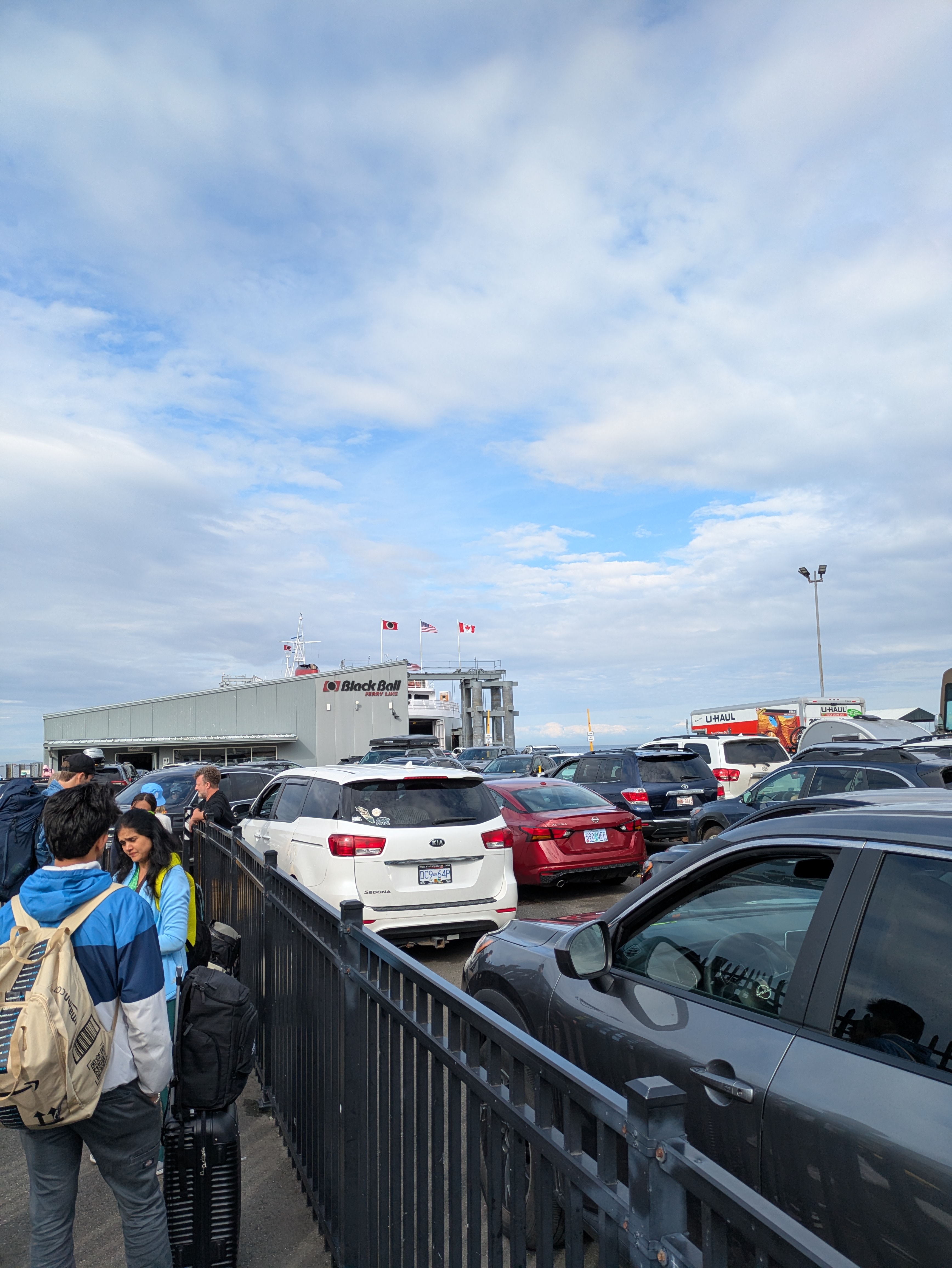 Line by line, cars drove aboard. I was the last in my line, and halfway through, they stopped us from turning onto the road to the ramp. A worker radioed the guys on the ship, letting cars in one at a time as he got confirmation. Finally, I was the only one left, praying for the signal to board. A minute later, he waved me forward, and I squeezed on as the final car—parked tight against the rear door.