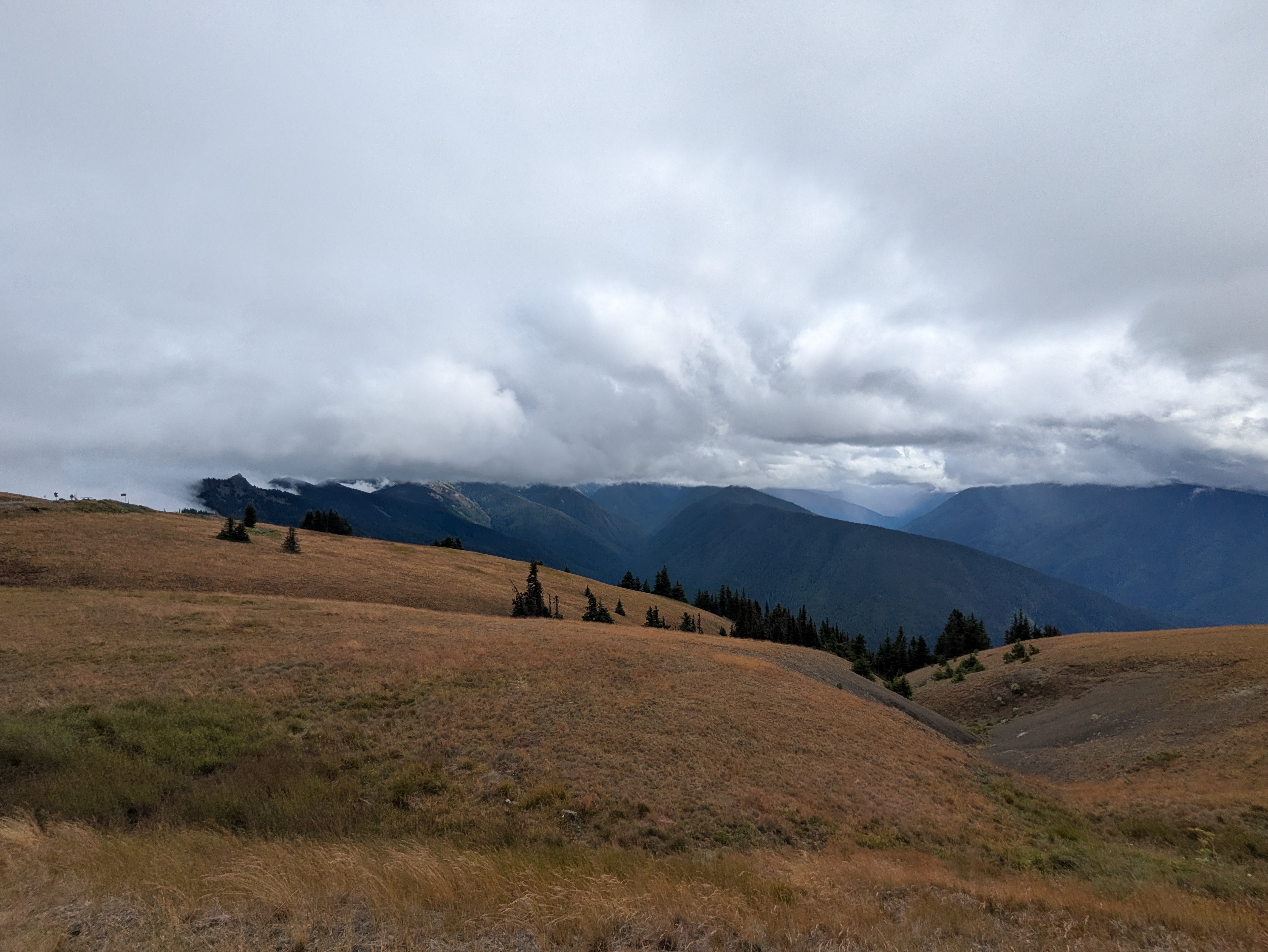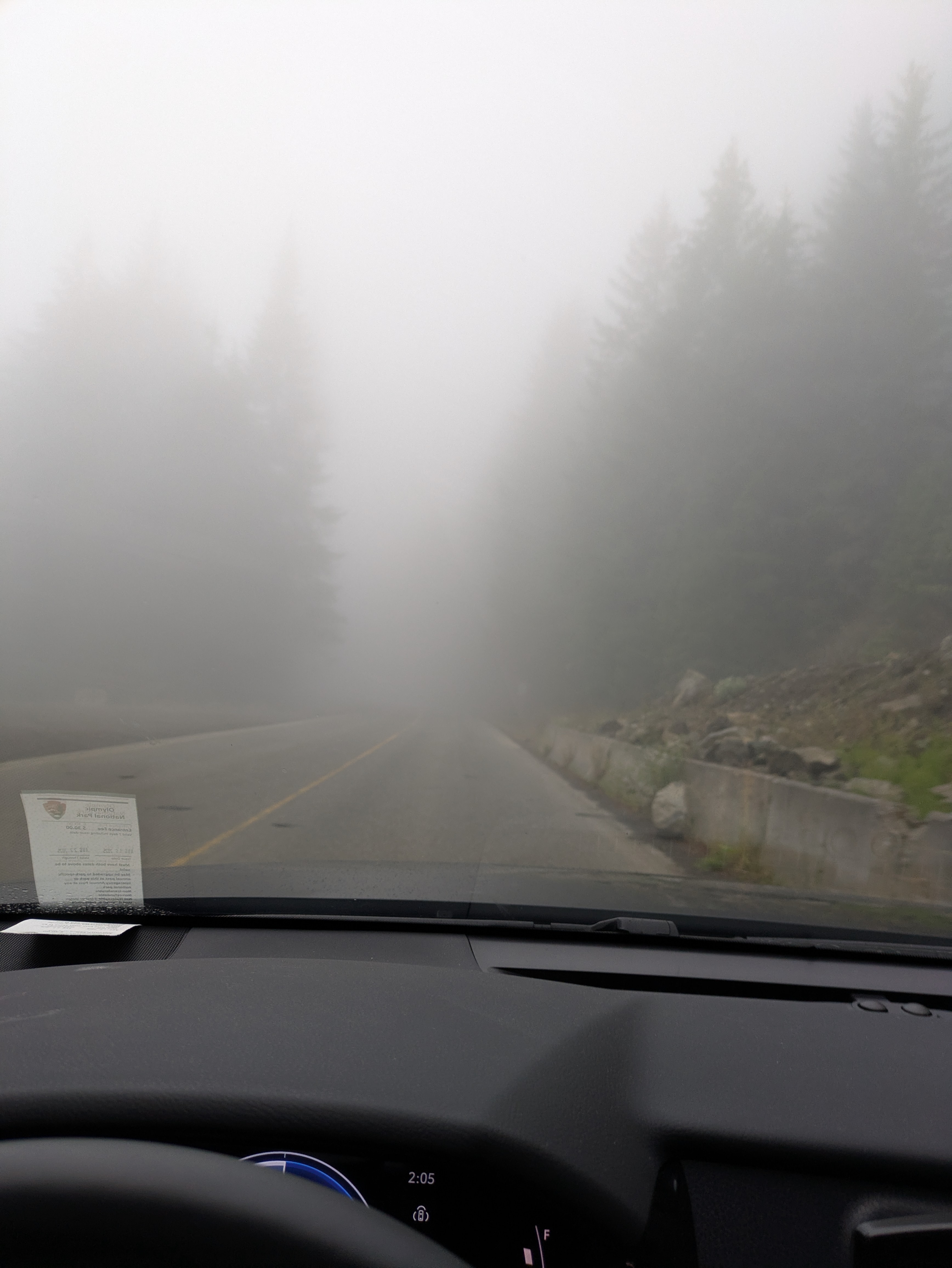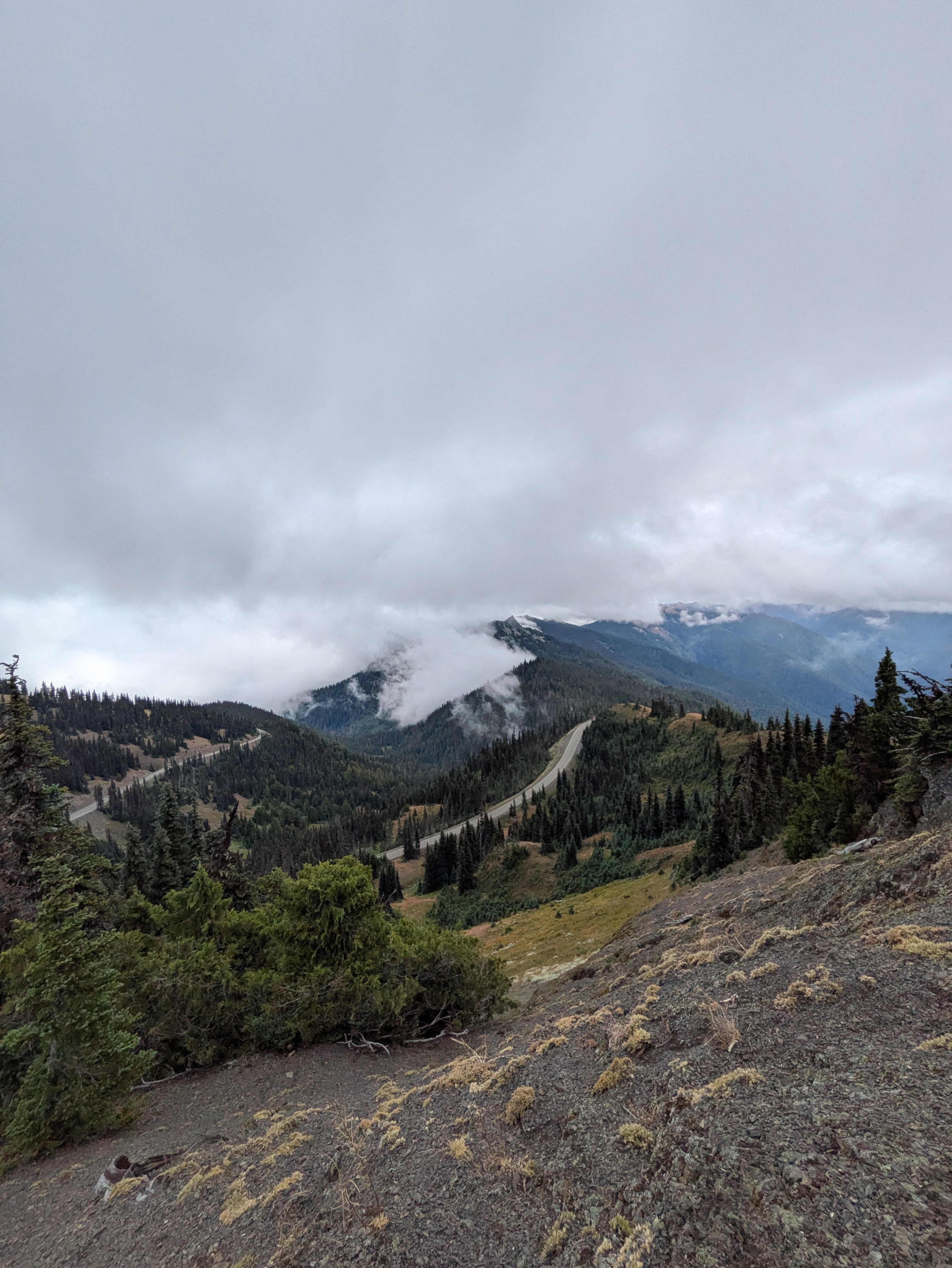 As I neared Port Angeles, low clouds rolled in and a light rain began. I wanted to visit Hurricane Ridge that day, but visibility dropped to near zero on the mountain road. I stopped at a turnout and almost turned back—but then checked a live cam at the summit. Visibility looked decent, with patches of sunshine breaking through!