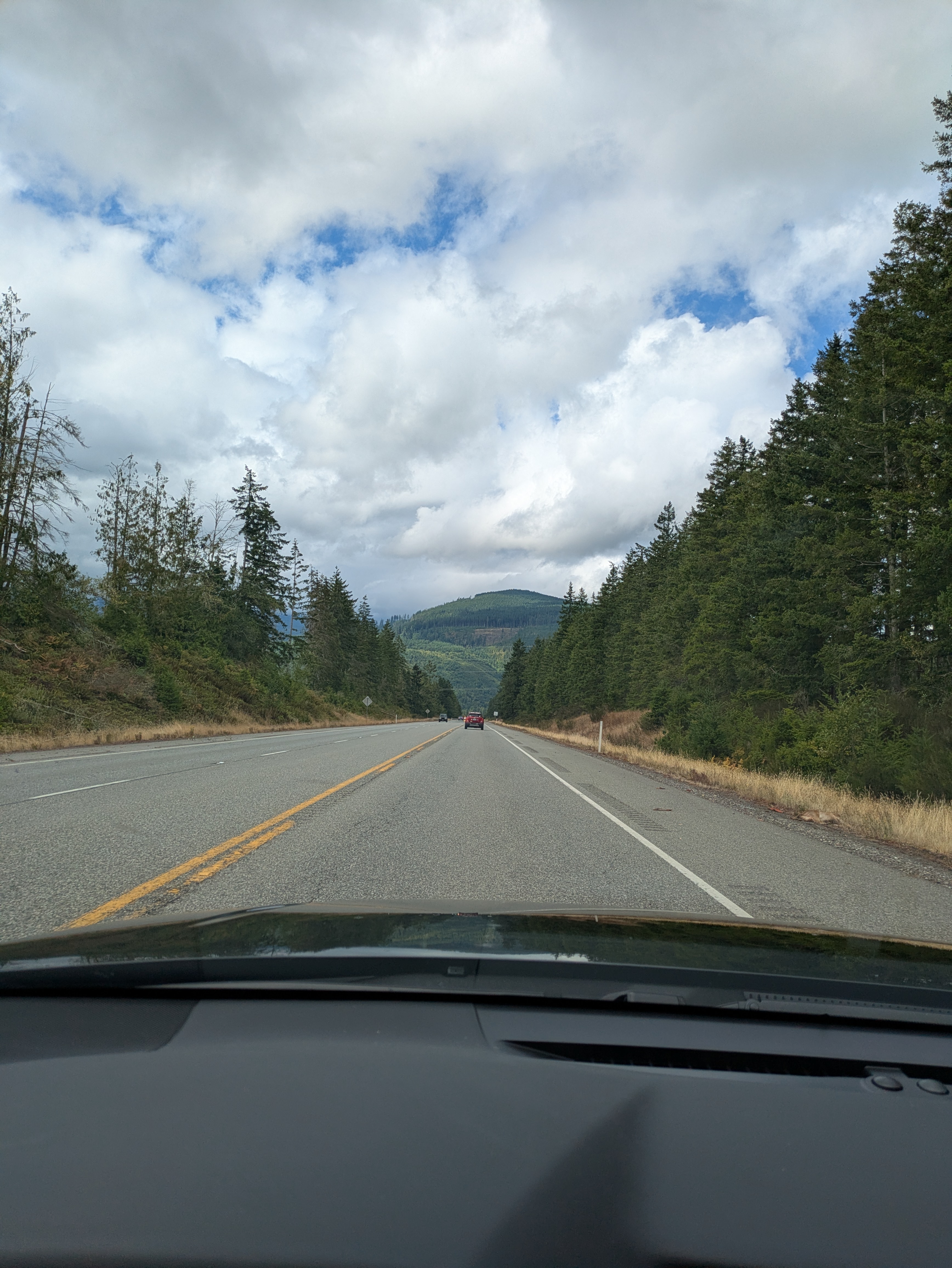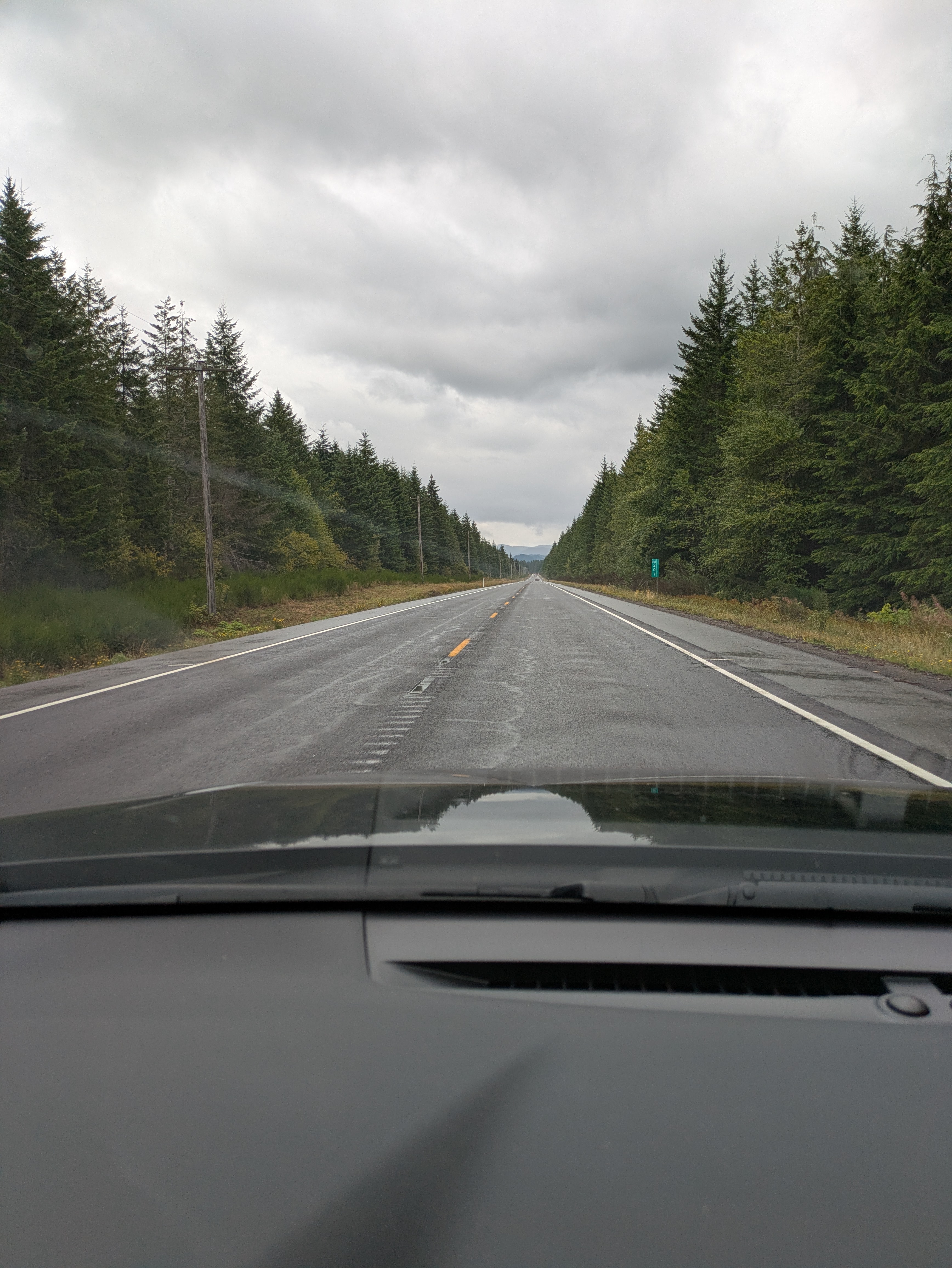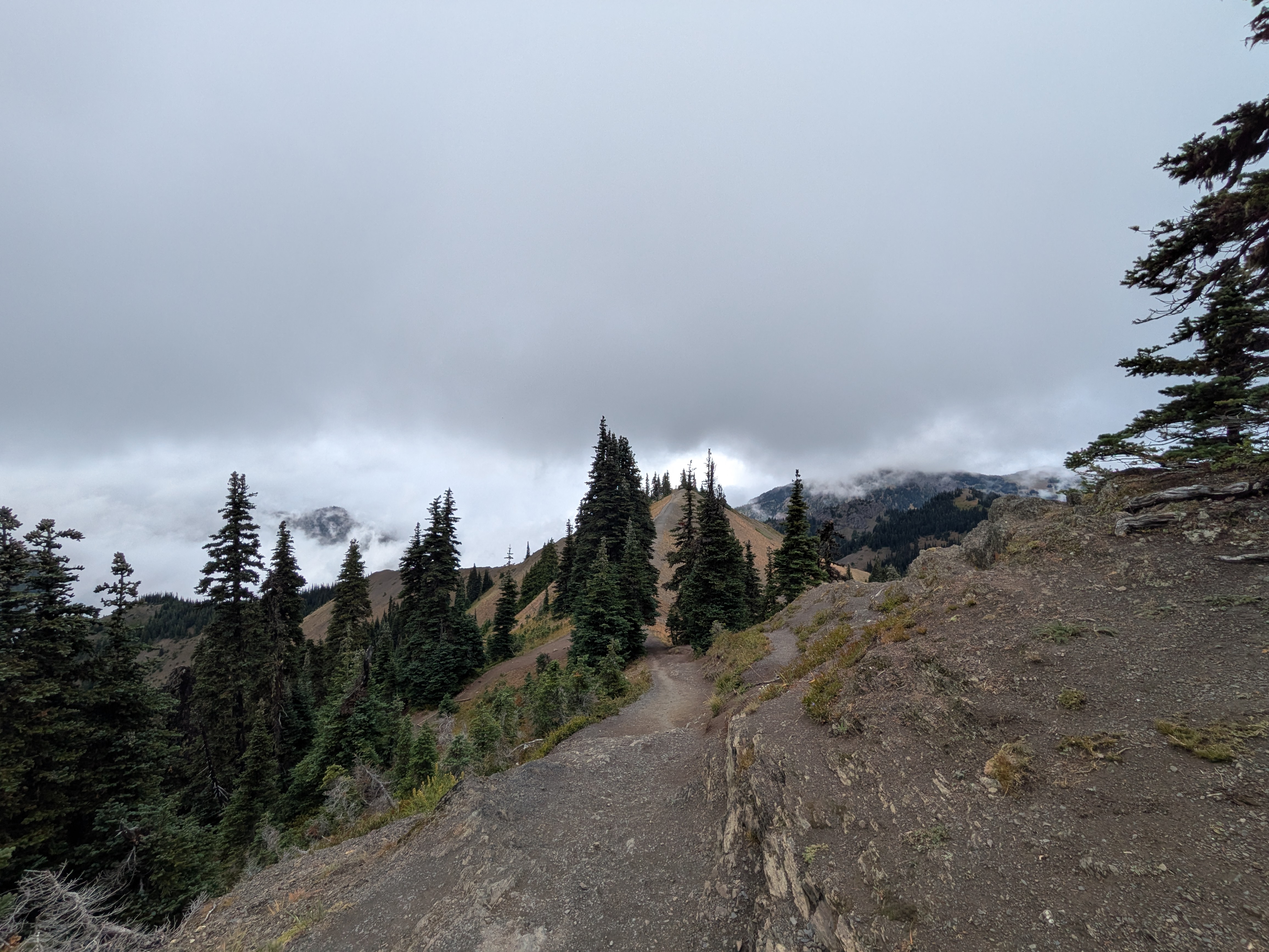As I neared Port Angeles, low clouds rolled in and a light rain began. I wanted to visit Hurricane Ridge that day, but visibility dropped to near zero on the mountain road. I stopped at a turnout and almost turned back—but then checked a live cam at the summit. Visibility looked decent, with patches of sunshine breaking through!