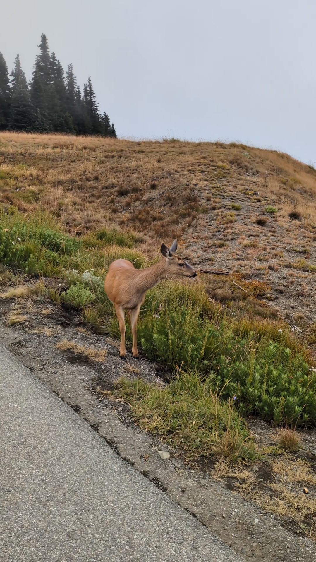 As I neared Port Angeles, low clouds rolled in and a light rain began. I wanted to visit Hurricane Ridge that day, but visibility dropped to near zero on the mountain road. I stopped at a turnout and almost turned back—but then checked a live cam at the summit. Visibility looked decent, with patches of sunshine breaking through!